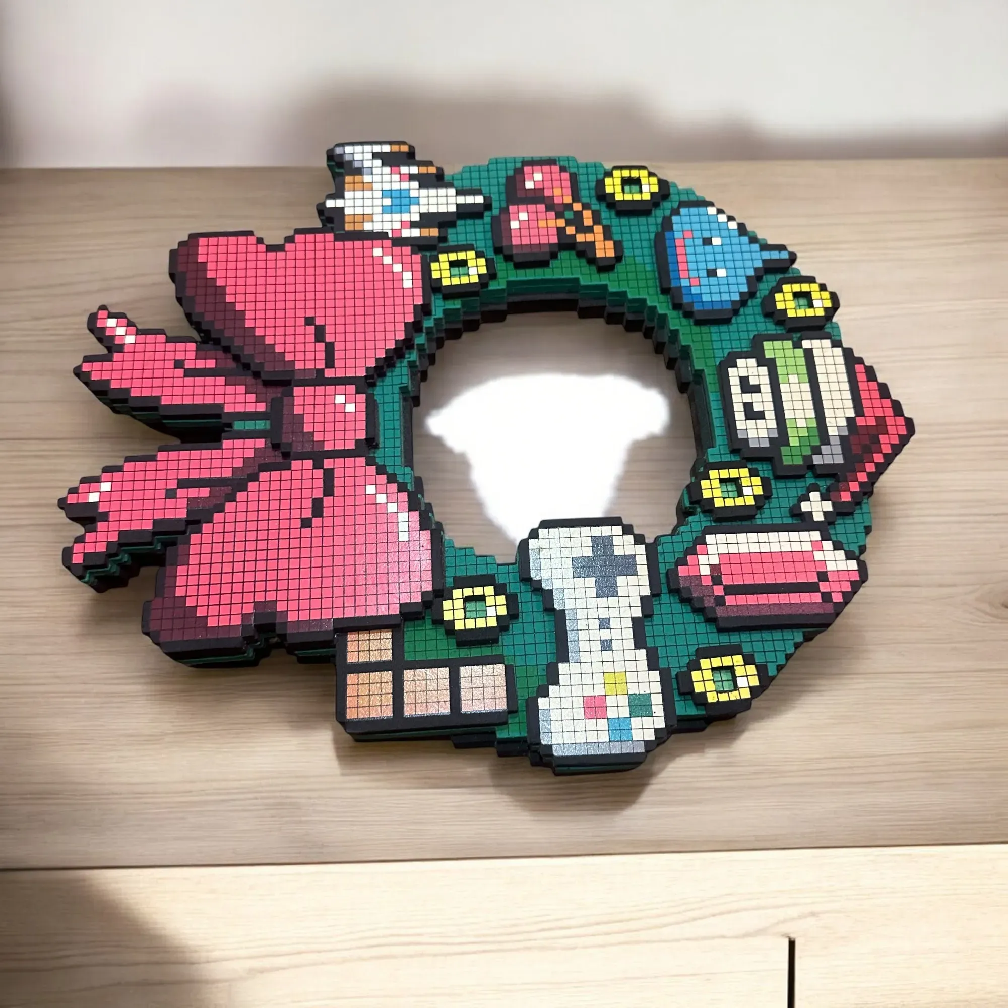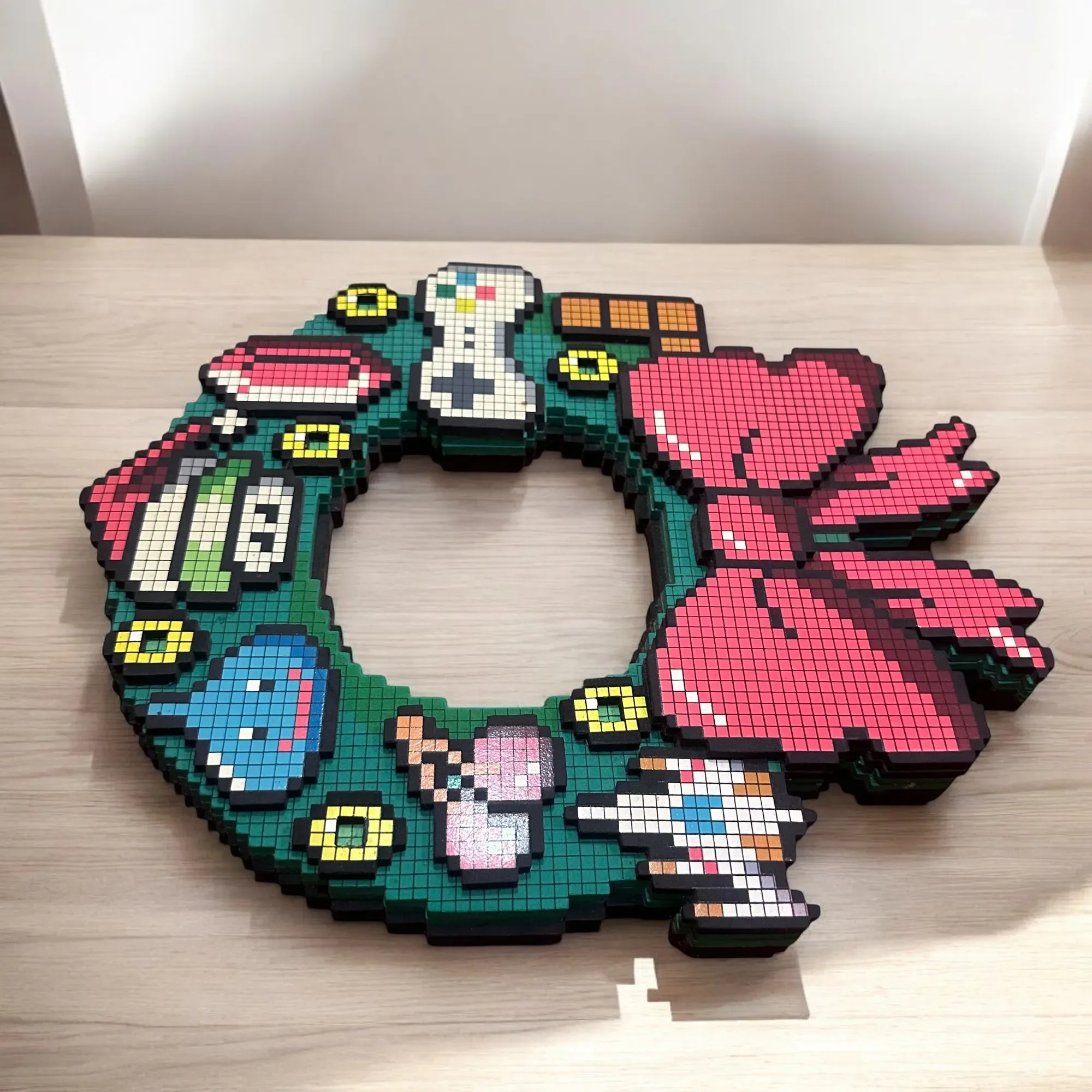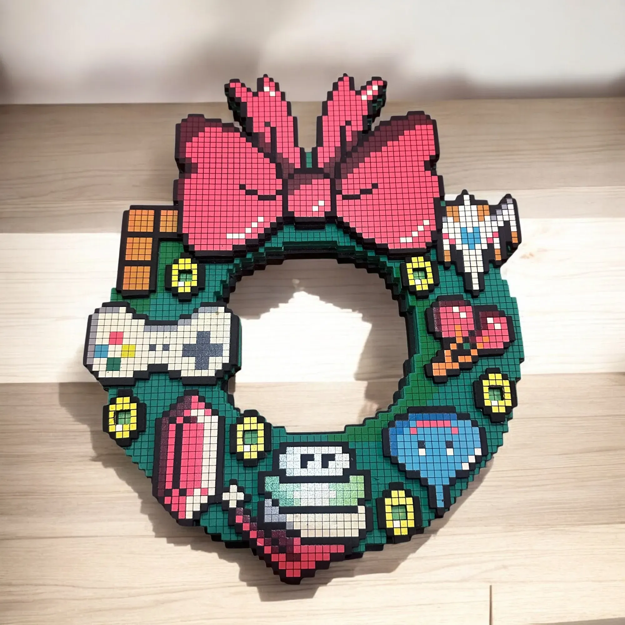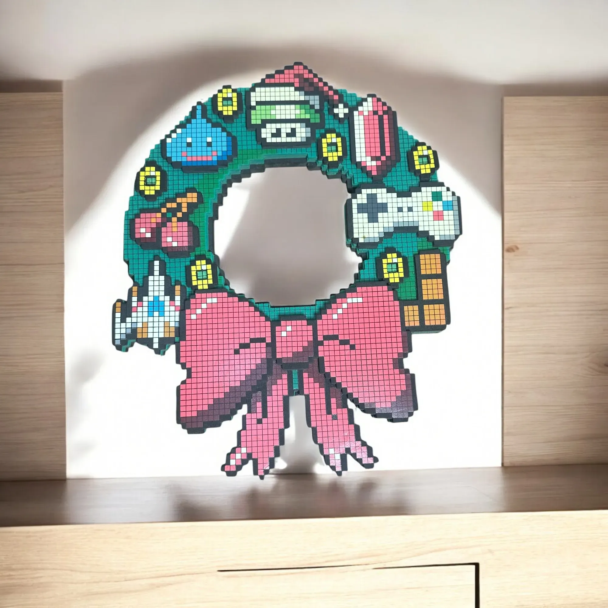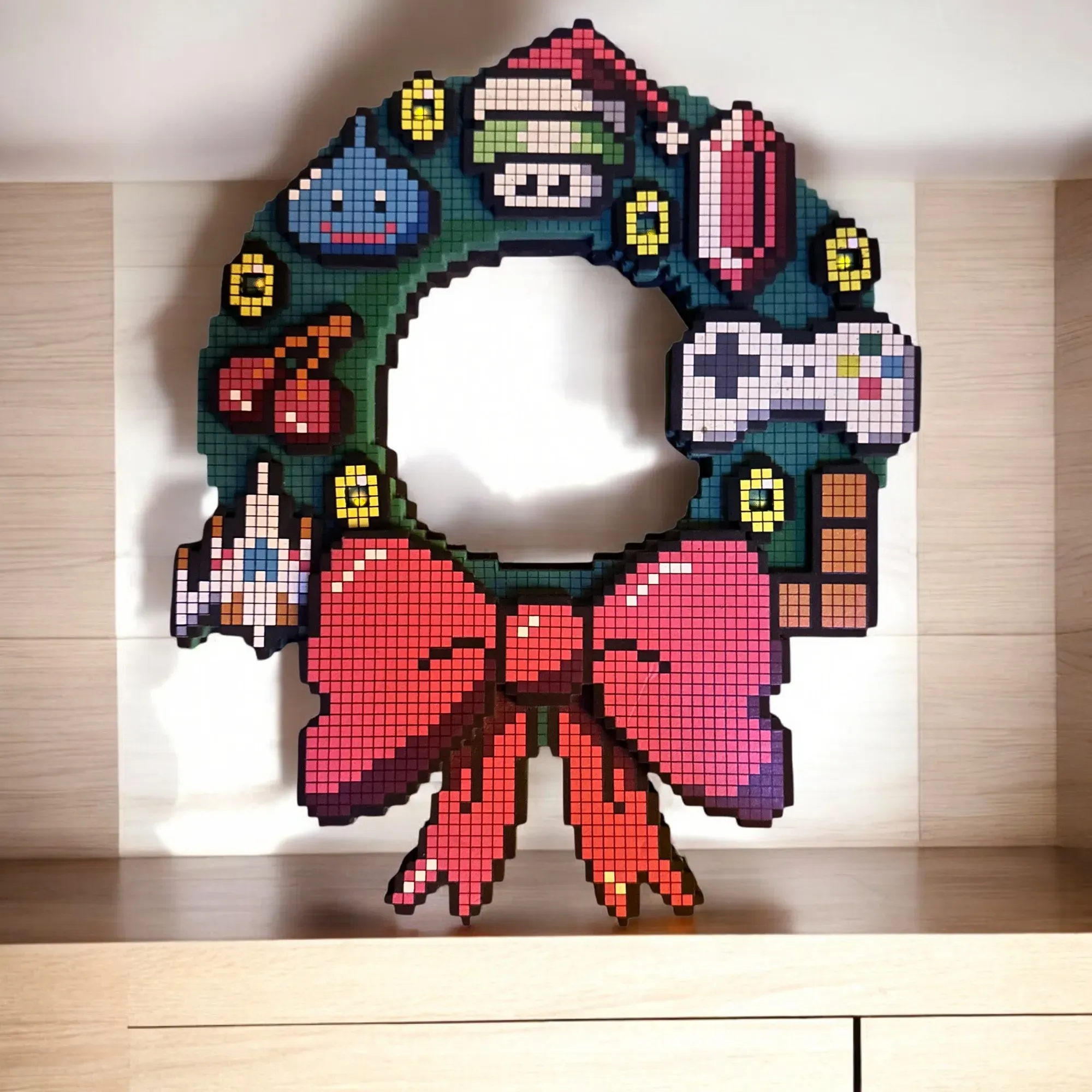 Celebra las fiestas con un toque geek actualizando tu corona rústica con esta corona luminosa de alta tecnología de Nintendo Super Mario. La corona está decorada con gráficos de estilo retro de 8 bits y acentuada con 5 LED verdes que parpadearán de forma intermitente